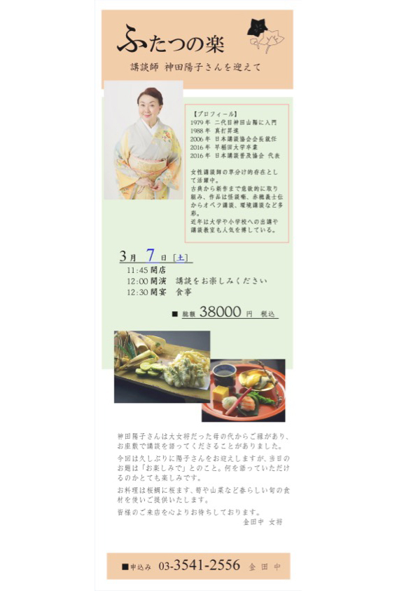 神田陽子さんは大女将だった母の代からご縁があり、 お座敷で講談を語ってくださることがありました。 今回は久しぶりに陽子さんをお迎えしますが、当日の お題は「お楽しみ」とのこと。何を語っていただけ るのかとても楽しみです。 お料理は桜鯛に桜ます、筍や山菜など春らしい旬の食 材を使いご提供いたします。 皆様のご来店を心よりお待ちしております。